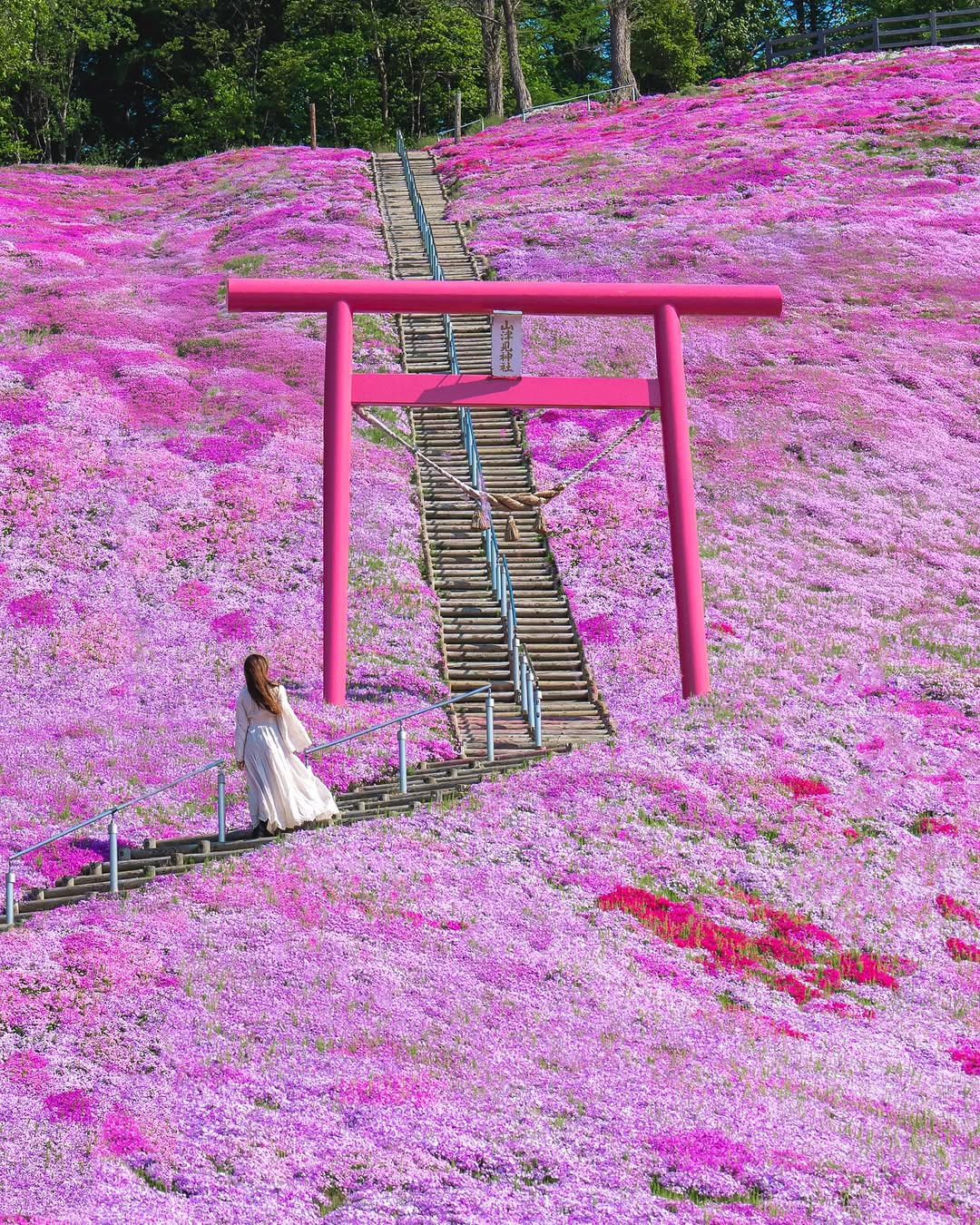 Shibazakura, còn gọi là "hoa chi anh", thường nở rộ từ cuối tháng 4 đến giữa tháng 5. Khác với hoa anh đào, Shibazakura mọc sát mặt đất, tạo thành những mảng màu rực rỡ – hồng, tím, trắng – như một bức tranh sống động giữa thiên nhiên Hokkaido.