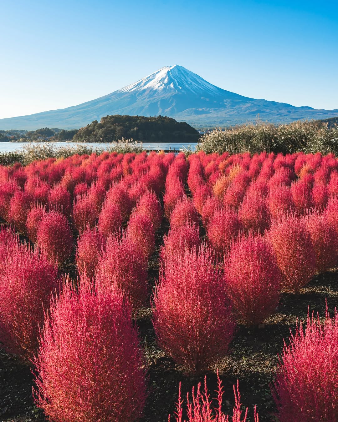 Tháng 10 là thời điểm lý tưởng để ngắm kochias Nhật Bản. Tại Oishi Park, hàng ngàn bụi kochia tròn xinh đồng loạt chuyển sang màu đỏ, tạo nên khung cảnh rực rỡ bên hồ Kawaguchiko với núi Phú Sĩ sừng sững phía xa.